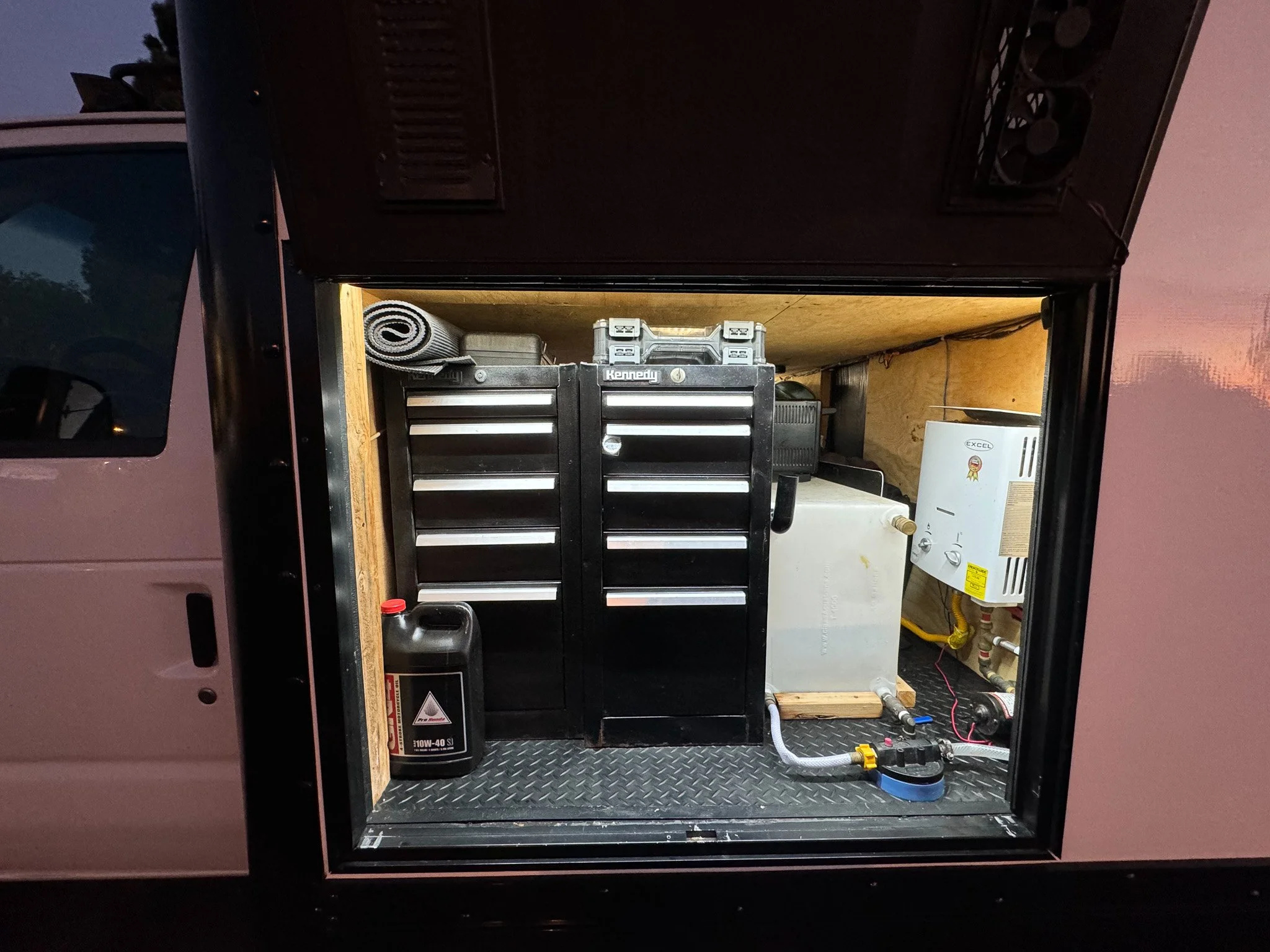 This rig is not your average box truck, it’s a Ford E450 camper van with a 6.0 Turbo Diesel engine that is fully equipped with everything you need for weeks of off grid living! Having a rad set up with a unique layout you don’t see too often out of box truck this size only having a total length of 21 1/2 feet, which is only 2 feet longer than your standard 144 Base Sprinter van. But being a box allows for much more spacious and livable way out with room to move around. This is a very rare sized box truck that you don’t see too often, but what’s really key is it’s Diesel engine which is usually not the case with most box trucks this size. Most having either a v8 or v10 gas engine which get terrible gas mileage. This rig is really well maintained and in great mechanical condition. Maintained with oil changes, oil and fuel filters as well as radiator flushes like clock work. No Engine lights or leaks. With only 148k miles this rigs got plenty of life left in it! Moving on to the build.